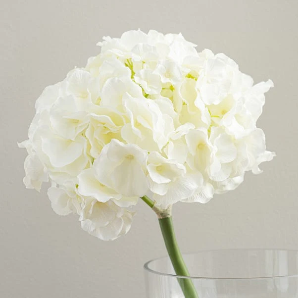 Featuring a large realistic hydrangea head, this artificial flower boasts a bunch of delicate cream petals and a green and purple stem.