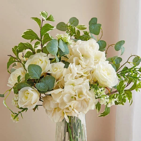 This beautiful artificial bouquet features larger-than-life white peonies and is displayed in a gorgeous, sleek, and elegant vase.