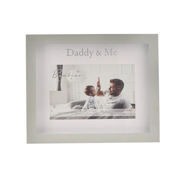 A Daddy & Me photo frame from BAMBINO BY JULIANA®. This affectionately personalised frame is a heart-warming gift for new fathers. The wooden frame has a matt grey finish, enhanced by a large white mount, complete with ‘Daddy & Me’ silver foil embossed decal and landscape aperture. The frame is designed for either freestanding display or wall hanging. The frame is packaged in a white closed box.