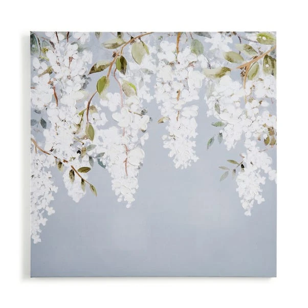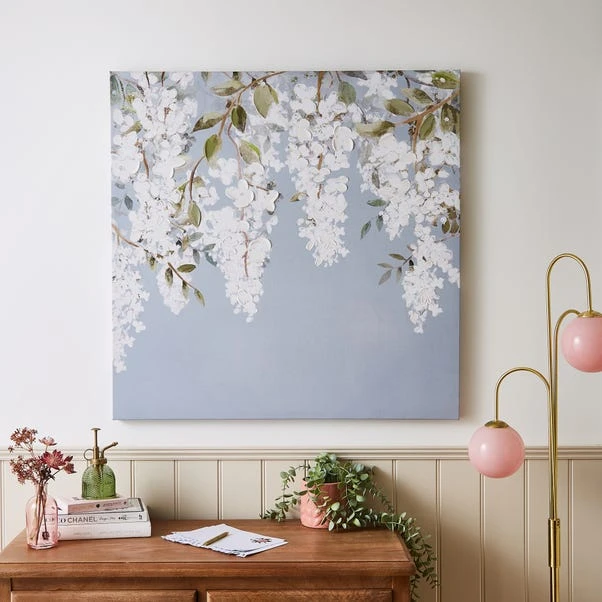 Indulge in the charm of our Blue Wisteria Canvas. This elegant artwork showcases a beautiful painting print of delicate white wisteria hanging gracefully, capturing the essence of nature’s beauty.