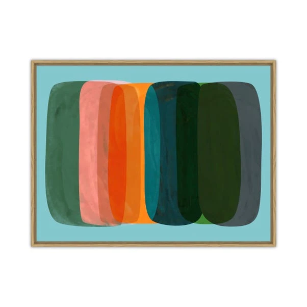 Add a splash of colour to your space with this striking abstract canvas, by Print Punk Studio. Featuring a vibrant mix of green, pink, orange, and blue against a bold aqua background, the geometric shapes create a modern, eye-catching focal point. The smooth, rounded forms and clean aesthetic bring a contemporary touch to any room, effortlessly complementing a variety of interior styles. Float framed in a natural wood-coloured frame, the canvas appears to hover for a sleek, gallery-style finish. Ready to hang, itβs an easy way to refresh your walls with bold design and artistic flair.