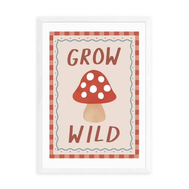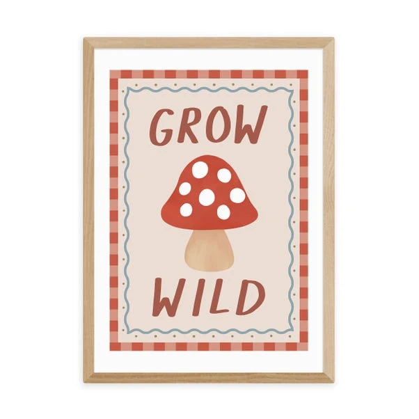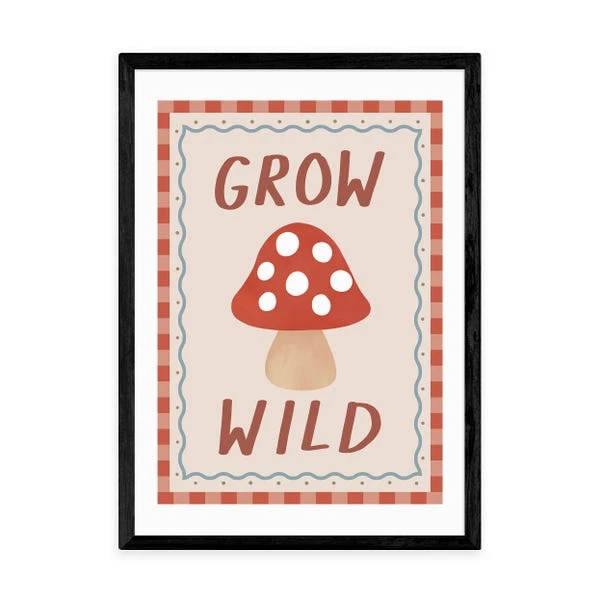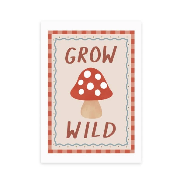 This Grow Wild print displays a quirky mushroom with the encouraging words “Grow Wild”. The colourful design and patterned border add a touch of whimsy, making it perfect for a nursery or children’s room.