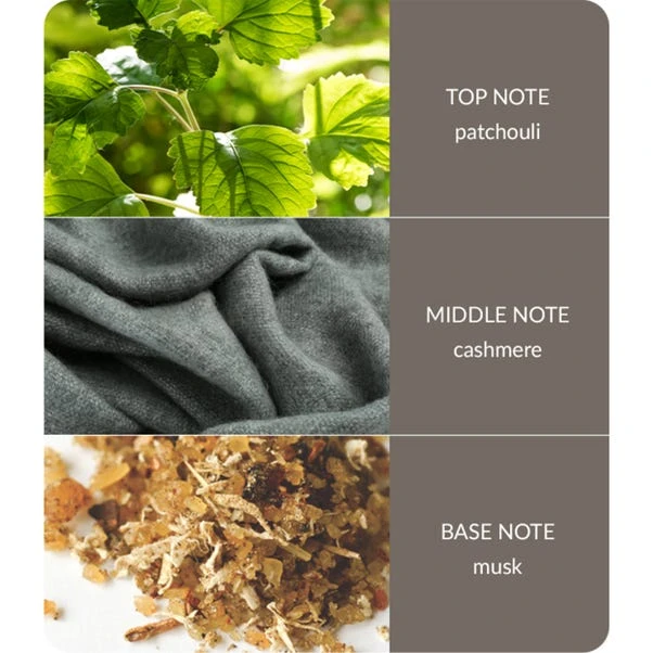 A softly alluring mix of chamomile and cashmere tinted by slivers of clean musk on an earthy base of patchouli will bring warmth, calm and a touch of mystery to your surroundings.
