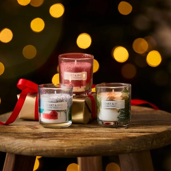 Discover three irresistible festive scents with the Heart and Home Mini Candle Collection. This gift set features Christmas Magic, Christmas Tree, and Winter Berry Frost mini candles, each with 15 hours of burn time. These fragrance-rich soy blend candles are perfect for sampling your favorite holiday aromas, all beautifully packaged for gifting.