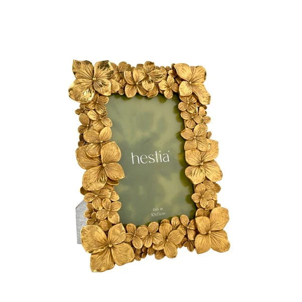 This beautifully designed Hestia Gold Flower Photo Frame features a metallic effect finish with delicate gold flower accents, bringing elegance and sophistication to any space. The stylish frame fits well with a contemporary yet timeless look. Designed for portrait or landscape orientation, it includes a sturdy stand for easy display on any surface. This photo frame is available in multiple sizes.