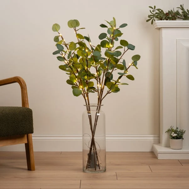 Brighten up your space with this set of 2 stylish eucalyptus branches featuring warm white LED lights. With two branches connected by one light chain, they offer a touch of nature without the upkeep. Powered by a single, easy-to-conceal battery pack, they’re perfect for indoor spaces like your living room, bedroom, or office. There’s no need for sunlight or watering, making them a fuss-free way to add greenery.