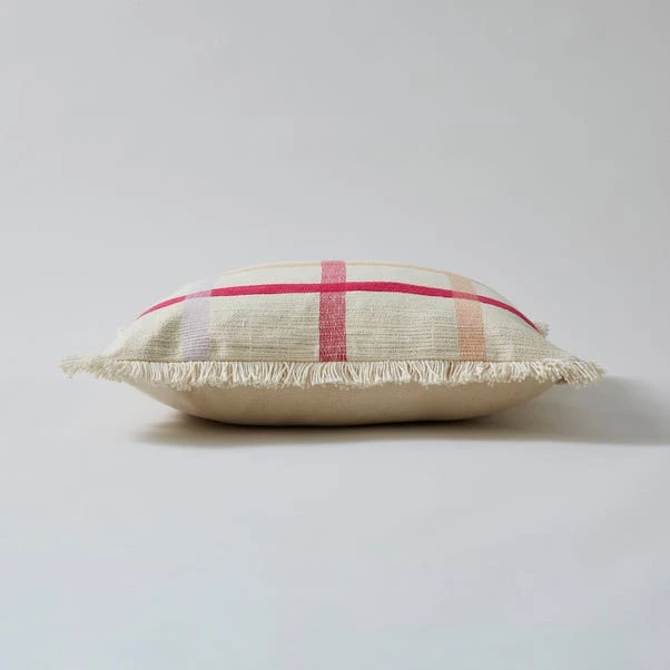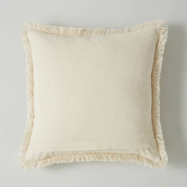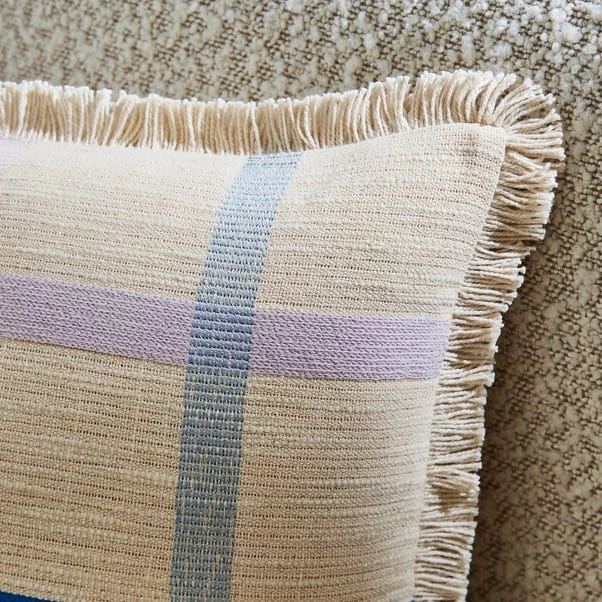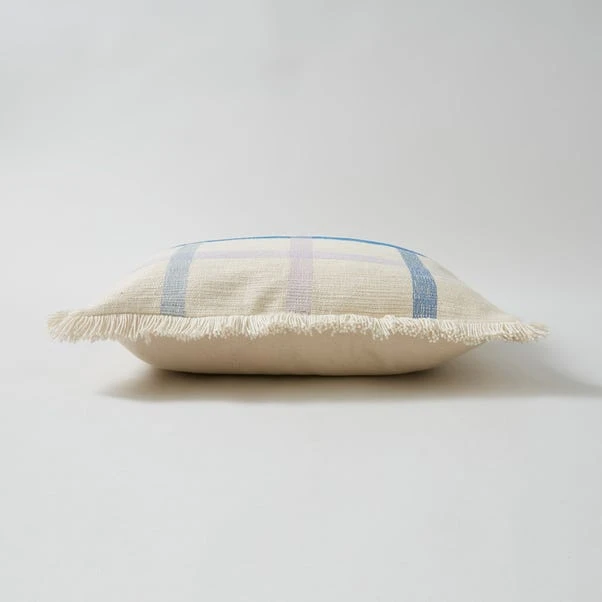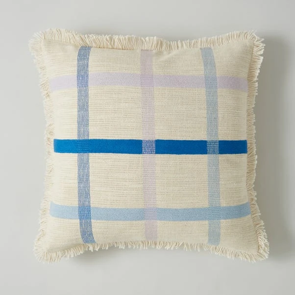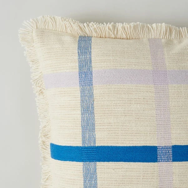 Add a touch of modern sophistication to you home with this beautiful check cushion. Comprised of 100% cotton with a slub effect, this cushion boasts a large embroidered check pattern with a playful fringe around the edge creating a sense of luxuriousness whilst evoking a sense of modernism at the same time.