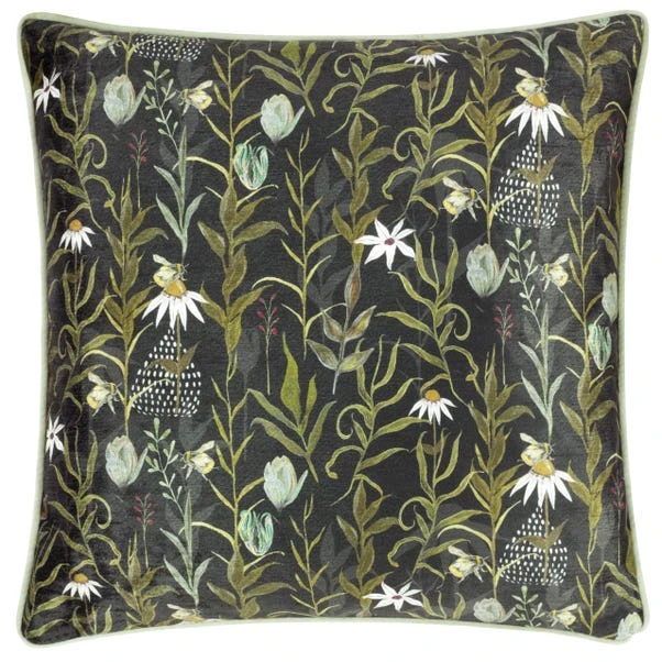 Celebrate the beauty of nature with the Wylder Nature Meadow Bloom Square Cushion Cover, featuring a detailed print of foliage, delicate blooms, and buzzing bees on chenille fabric. The plain reverse and piped edge provide a polished and refined look.